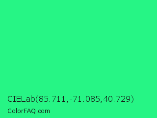 CIELab 85.711,-71.085,40.729 Color is a normal green color and the nearest color is Spring Green #00ff7f. Hex code #26f585 and RGB value is rgb(38,245,133). In RGB color space, this color is composed of 15% red, 96% green, 52% blue, In CMYK color space, this color is composed of 84% cyan, 0% magenta, 46% yellow , 4% black , In HSL color space, this color has a hue angle of 148° , 91% saturation and 55% lightness.