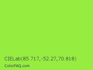 CIELab 85.717,-52.27,70.818 Color is a normal green color and the nearest color is Kiwi #8ee53f. Hex code #96ed40 and RGB value is rgb(150,237,64). In RGB color space, this color is composed of 59% red, 93% green, 25% blue, In CMYK color space, this color is composed of 37% cyan, 0% magenta, 73% yellow , 7% black , In HSL color space, this color has a hue angle of 90° , 83% saturation and 59% lightness.