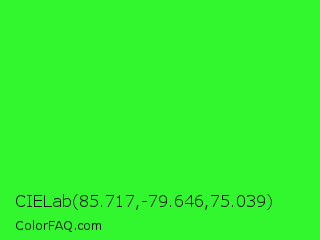 CIELab 85.717,-79.646,75.039 Color is a normal green color and the nearest color is Neon Green #39ff14. Hex code #33f72e and RGB value is rgb(51,247,46). In RGB color space, this color is composed of 20% red, 97% green, 18% blue, In CMYK color space, this color is composed of 79% cyan, 0% magenta, 81% yellow , 3% black , In HSL color space, this color has a hue angle of 119° , 93% saturation and 57% lightness.