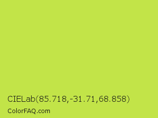 CIELab 85.718,-31.71,68.858 Color is a normal lime color and the nearest color is June Bud #bdda57. Hex code #c2e448 and RGB value is rgb(194,228,72). In RGB color space, this color is composed of 76% red, 89% green, 28% blue, In CMYK color space, this color is composed of 15% cyan, 0% magenta, 68% yellow , 11% black , In HSL color space, this color has a hue angle of 73° , 74% saturation and 59% lightness.