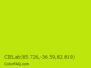 CIELab 85.726,-36.59,82.819 Color is a normal lime color and the nearest color is Fuego #bede0d. Hex code #bde60d and RGB value is rgb(189,230,13). In RGB color space, this color is composed of 74% red, 90% green, 5% blue, In CMYK color space, this color is composed of 18% cyan, 0% magenta, 94% yellow , 10% black , In HSL color space, this color has a hue angle of 71° , 89% saturation and 48% lightness.
