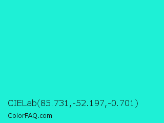 CIELab 85.731,-52.197,-0.701 Color is a normal cyan color and the nearest color is Bright Turquoise #08e8de. Hex code #1ef0d6 and RGB value is rgb(30,240,214). In RGB color space, this color is composed of 12% red, 94% green, 84% blue, In CMYK color space, this color is composed of 88% cyan, 0% magenta, 11% yellow , 6% black , In HSL color space, this color has a hue angle of 173° , 88% saturation and 53% lightness.