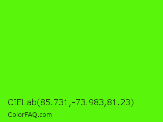 CIELab 85.731,-73.983,81.23 Color is a normal green color and the nearest color is Bright Green #66ff00. Hex code #59f50a and RGB value is rgb(89,245,10). In RGB color space, this color is composed of 35% red, 96% green, 4% blue, In CMYK color space, this color is composed of 64% cyan, 0% magenta, 96% yellow , 4% black , In HSL color space, this color has a hue angle of 100° , 92% saturation and 50% lightness.