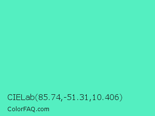 CIELab 85.74,-51.31,10.406 Color is a light green color and the nearest color is Turquoise #40e0d0. Hex code #54efc1 and RGB value is rgb(84,239,193). In RGB color space, this color is composed of 33% red, 94% green, 76% blue, In CMYK color space, this color is composed of 65% cyan, 0% magenta, 19% yellow , 6% black , In HSL color space, this color has a hue angle of 162° , 83% saturation and 63% lightness.