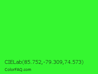 CIELab 85.752,-79.309,74.573 Color is a normal green color and the nearest color is Neon Green #39ff14. Hex code #35f730 and RGB value is rgb(53,247,48). In RGB color space, this color is composed of 21% red, 97% green, 19% blue, In CMYK color space, this color is composed of 79% cyan, 0% magenta, 81% yellow , 3% black , In HSL color space, this color has a hue angle of 118° , 93% saturation and 58% lightness.