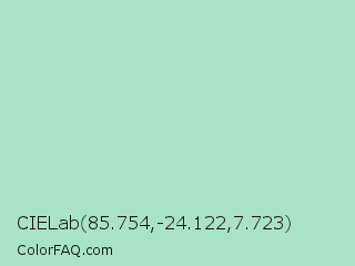 CIELab 85.754,-24.122,7.723 Color is a light green color and the nearest color is Padua #ade6c4. Hex code #a9e3c7 and RGB value is rgb(169,227,199). In RGB color space, this color is composed of 66% red, 89% green, 78% blue, In CMYK color space, this color is composed of 26% cyan, 0% magenta, 12% yellow , 11% black , In HSL color space, this color has a hue angle of 151° , 51% saturation and 78% lightness.