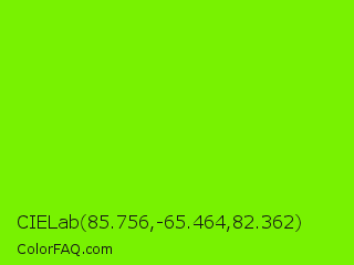 CIELab 85.756,-65.464,82.362 Color is a normal green color and the nearest color is Lawn Green #7cfc00. Hex code #78f201 and RGB value is rgb(120,242,1). In RGB color space, this color is composed of 47% red, 95% green, 0% blue, In CMYK color space, this color is composed of 50% cyan, 0% magenta, 100% yellow , 5% black , In HSL color space, this color has a hue angle of 90° , 99% saturation and 48% lightness.
