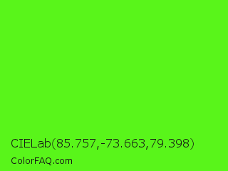 CIELab 85.757,-73.663,79.398 Color is a normal green color and the nearest color is Bright Green #66ff00. Hex code #59f51a and RGB value is rgb(89,245,26). In RGB color space, this color is composed of 35% red, 96% green, 10% blue, In CMYK color space, this color is composed of 64% cyan, 0% magenta, 89% yellow , 4% black , In HSL color space, this color has a hue angle of 103° , 92% saturation and 53% lightness.