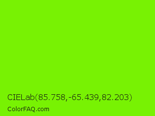 CIELab 85.758,-65.439,82.203 Color is a normal green color and the nearest color is Lawn Green #7cfc00. Hex code #78f203 and RGB value is rgb(120,242,3). In RGB color space, this color is composed of 47% red, 95% green, 1% blue, In CMYK color space, this color is composed of 50% cyan, 0% magenta, 99% yellow , 5% black , In HSL color space, this color has a hue angle of 91° , 98% saturation and 48% lightness.