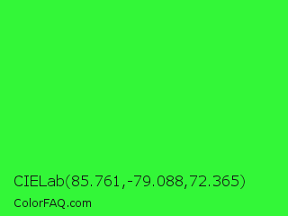 CIELab 85.761,-79.088,72.365 Color is a normal green color and the nearest color is Neon Green #39ff14. Hex code #33f738 and RGB value is rgb(51,247,56). In RGB color space, this color is composed of 20% red, 97% green, 22% blue, In CMYK color space, this color is composed of 79% cyan, 0% magenta, 77% yellow , 3% black , In HSL color space, this color has a hue angle of 122° , 92% saturation and 58% lightness.