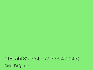 CIELab 85.764,-52.733,47.045 Color is a light green color and the nearest color is Pastel Green #77dd77. Hex code #85ee79 and RGB value is rgb(133,238,121). In RGB color space, this color is composed of 52% red, 93% green, 47% blue, In CMYK color space, this color is composed of 44% cyan, 0% magenta, 49% yellow , 7% black , In HSL color space, this color has a hue angle of 114° , 77% saturation and 70% lightness.
