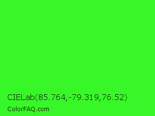 CIELab 85.764,-79.319,76.52 Color is a normal green color and the nearest color is Neon Green #39ff14. Hex code #38f728 and RGB value is rgb(56,247,40). In RGB color space, this color is composed of 22% red, 97% green, 16% blue, In CMYK color space, this color is composed of 77% cyan, 0% magenta, 84% yellow , 3% black , In HSL color space, this color has a hue angle of 115° , 93% saturation and 56% lightness.