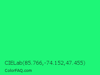 CIELab 85.766,-74.152,47.455 Color is a normal green color and the nearest color is Spring Green #00ff7f. Hex code #1ef677 and RGB value is rgb(30,246,119). In RGB color space, this color is composed of 12% red, 96% green, 47% blue, In CMYK color space, this color is composed of 88% cyan, 0% magenta, 52% yellow , 4% black , In HSL color space, this color has a hue angle of 145° , 92% saturation and 54% lightness.