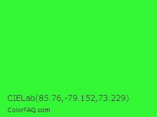 CIELab 85.76,-79.152,73.229 Color is a normal green color and the nearest color is Neon Green #39ff14. Hex code #34f735 and RGB value is rgb(52,247,53). In RGB color space, this color is composed of 20% red, 97% green, 21% blue, In CMYK color space, this color is composed of 79% cyan, 0% magenta, 79% yellow , 3% black , In HSL color space, this color has a hue angle of 120° , 92% saturation and 59% lightness.