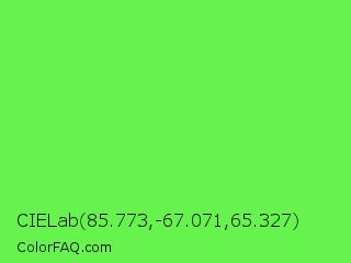 CIELab 85.773,-67.071,65.327 Color is a light green color and the nearest color is Screamin Green #66ff66. Hex code #67f34e and RGB value is rgb(103,243,78). In RGB color space, this color is composed of 40% red, 95% green, 31% blue, In CMYK color space, this color is composed of 58% cyan, 0% magenta, 68% yellow , 5% black , In HSL color space, this color has a hue angle of 111° , 87% saturation and 63% lightness.