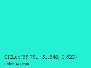 CIELab 85.781,-51.848,-0.623 Color is a normal cyan color and the nearest color is Bright Turquoise #08e8de. Hex code #24f0d6 and RGB value is rgb(36,240,214). In RGB color space, this color is composed of 14% red, 94% green, 84% blue, In CMYK color space, this color is composed of 85% cyan, 0% magenta, 11% yellow , 6% black , In HSL color space, this color has a hue angle of 172° , 87% saturation and 54% lightness.