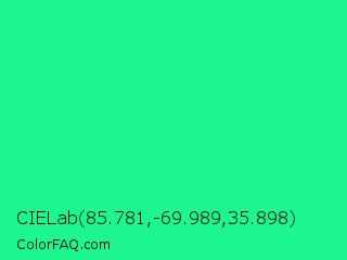 CIELab 85.781,-69.989,35.898 Color is a normal green color and the nearest color is Medium Spring Green #00fa9a. Hex code #1df58f and RGB value is rgb(29,245,143). In RGB color space, this color is composed of 11% red, 96% green, 56% blue, In CMYK color space, this color is composed of 88% cyan, 0% magenta, 42% yellow , 4% black , In HSL color space, this color has a hue angle of 152° , 92% saturation and 54% lightness.