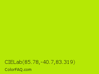 CIELab 85.78,-40.7,83.319 Color is a normal lime color and the nearest color is Fuego #bede0d. Hex code #b5e805 and RGB value is rgb(181,232,5). In RGB color space, this color is composed of 71% red, 91% green, 2% blue, In CMYK color space, this color is composed of 22% cyan, 0% magenta, 98% yellow , 9% black , In HSL color space, this color has a hue angle of 73° , 96% saturation and 46% lightness.