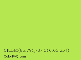 CIELab 85.791,-37.516,65.254 Color is a light green color and the nearest color is Inchworm #b2ec5d. Hex code #b5e751 and RGB value is rgb(181,231,81). In RGB color space, this color is composed of 71% red, 91% green, 32% blue, In CMYK color space, this color is composed of 22% cyan, 0% magenta, 65% yellow , 9% black , In HSL color space, this color has a hue angle of 80° , 76% saturation and 61% lightness.