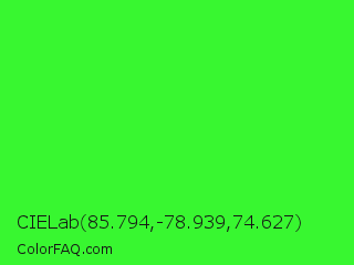 CIELab 85.794,-78.939,74.627 Color is a normal green color and the nearest color is Neon Green #39ff14. Hex code #38f730 and RGB value is rgb(56,247,48). In RGB color space, this color is composed of 22% red, 97% green, 19% blue, In CMYK color space, this color is composed of 77% cyan, 0% magenta, 81% yellow , 3% black , In HSL color space, this color has a hue angle of 118° , 93% saturation and 58% lightness.