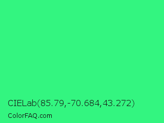 CIELab 85.79,-70.684,43.272 Color is a normal green color and the nearest color is UFO Green #3cd070. Hex code #33f580 and RGB value is rgb(51,245,128). In RGB color space, this color is composed of 20% red, 96% green, 50% blue, In CMYK color space, this color is composed of 79% cyan, 0% magenta, 48% yellow , 4% black , In HSL color space, this color has a hue angle of 144° , 91% saturation and 58% lightness.
