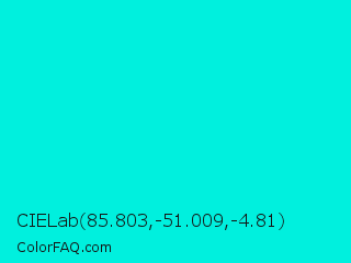 CIELab 85.803,-51.009,-4.81 Color is a normal cyan color and the nearest color is Bright Turquoise #08e8de. Hex code #00f0de and RGB value is rgb(0,240,222). In RGB color space, this color is composed of 0% red, 94% green, 87% blue, In CMYK color space, this color is composed of 100% cyan, 0% magenta, 8% yellow , 6% black , In HSL color space, this color has a hue angle of 176° , 100% saturation and 47% lightness.