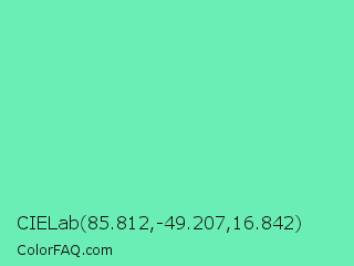 CIELab 85.812,-49.207,16.842 Color is a light green color and the nearest color is Medium Aquamarine #66ddaa. Hex code #6beeb5 and RGB value is rgb(107,238,181). In RGB color space, this color is composed of 42% red, 93% green, 71% blue, In CMYK color space, this color is composed of 55% cyan, 0% magenta, 24% yellow , 7% black , In HSL color space, this color has a hue angle of 154° , 79% saturation and 68% lightness.