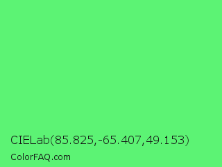 CIELab 85.825,-65.407,49.153 Color is a light green color and the nearest color is Screamin Green #66ff66. Hex code #5cf374 and RGB value is rgb(92,243,116). In RGB color space, this color is composed of 36% red, 95% green, 45% blue, In CMYK color space, this color is composed of 62% cyan, 0% magenta, 52% yellow , 5% black , In HSL color space, this color has a hue angle of 130° , 86% saturation and 66% lightness.