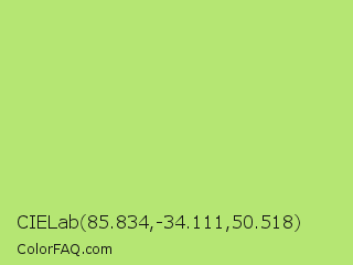CIELab 85.834,-34.111,50.518 Color is a light green color and the nearest color is Sulu #c1f07c. Hex code #b5e673 and RGB value is rgb(181,230,115). In RGB color space, this color is composed of 71% red, 90% green, 45% blue, In CMYK color space, this color is composed of 21% cyan, 0% magenta, 50% yellow , 10% black , In HSL color space, this color has a hue angle of 86° , 70% saturation and 68% lightness.