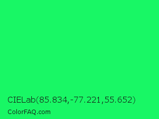 CIELab 85.834,-77.221,55.652 Color is a normal green color and the nearest color is Spring Green #00ff7f. Hex code #18f765 and RGB value is rgb(24,247,101). In RGB color space, this color is composed of 9% red, 97% green, 40% blue, In CMYK color space, this color is composed of 90% cyan, 0% magenta, 59% yellow , 3% black , In HSL color space, this color has a hue angle of 141° , 93% saturation and 53% lightness.