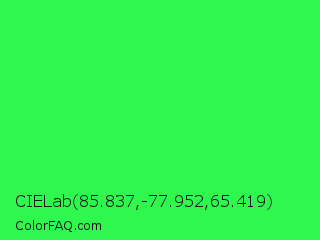 CIELab 85.837,-77.952,65.419 Color is a normal green color and the nearest color is Malachite #0bda51. Hex code #2ff74d and RGB value is rgb(47,247,77). In RGB color space, this color is composed of 18% red, 97% green, 30% blue, In CMYK color space, this color is composed of 81% cyan, 0% magenta, 69% yellow , 3% black , In HSL color space, this color has a hue angle of 129° , 93% saturation and 58% lightness.