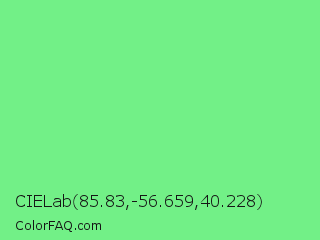 CIELab 85.83,-56.659,40.228 Color is a light green color and the nearest color is Very Light Malachite Green #64e986. Hex code #72f087 and RGB value is rgb(114,240,135). In RGB color space, this color is composed of 45% red, 94% green, 53% blue, In CMYK color space, this color is composed of 53% cyan, 0% magenta, 44% yellow , 6% black , In HSL color space, this color has a hue angle of 130° , 81% saturation and 69% lightness.