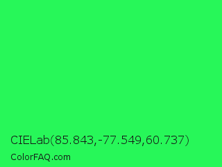 CIELab 85.843,-77.549,60.737 Color is a normal green color and the nearest color is Malachite #0bda51. Hex code #27f759 and RGB value is rgb(39,247,89). In RGB color space, this color is composed of 15% red, 97% green, 35% blue, In CMYK color space, this color is composed of 84% cyan, 0% magenta, 64% yellow , 3% black , In HSL color space, this color has a hue angle of 134° , 93% saturation and 56% lightness.