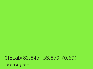 CIELab 85.845,-58.879,70.69 Color is a normal green color and the nearest color is Kiwi #8ee53f. Hex code #85f040 and RGB value is rgb(133,240,64). In RGB color space, this color is composed of 52% red, 94% green, 25% blue, In CMYK color space, this color is composed of 45% cyan, 0% magenta, 73% yellow , 6% black , In HSL color space, this color has a hue angle of 96° , 85% saturation and 60% lightness.