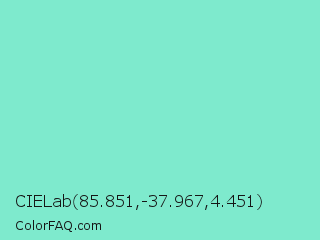 CIELab 85.851,-37.967,4.451 Color is a light cyan color and the nearest color is Riptide #8be6d8. Hex code #7eeacd and RGB value is rgb(126,234,205). In RGB color space, this color is composed of 49% red, 92% green, 80% blue, In CMYK color space, this color is composed of 46% cyan, 0% magenta, 12% yellow , 8% black , In HSL color space, this color has a hue angle of 164° , 72% saturation and 71% lightness.