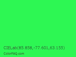 CIELab 85.858,-77.601,63.155 Color is a normal green color and the nearest color is Malachite #0bda51. Hex code #2df753 and RGB value is rgb(45,247,83). In RGB color space, this color is composed of 18% red, 97% green, 33% blue, In CMYK color space, this color is composed of 82% cyan, 0% magenta, 66% yellow , 3% black , In HSL color space, this color has a hue angle of 131° , 93% saturation and 57% lightness.