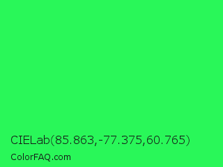 CIELab 85.863,-77.375,60.765 Color is a normal green color and the nearest color is Malachite #0bda51. Hex code #29f759 and RGB value is rgb(41,247,89). In RGB color space, this color is composed of 16% red, 97% green, 35% blue, In CMYK color space, this color is composed of 83% cyan, 0% magenta, 64% yellow , 3% black , In HSL color space, this color has a hue angle of 134° , 93% saturation and 56% lightness.