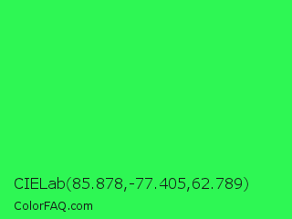 CIELab 85.878,-77.405,62.789 Color is a normal green color and the nearest color is Malachite #0bda51. Hex code #2ef754 and RGB value is rgb(46,247,84). In RGB color space, this color is composed of 18% red, 97% green, 33% blue, In CMYK color space, this color is composed of 81% cyan, 0% magenta, 66% yellow , 3% black , In HSL color space, this color has a hue angle of 131° , 93% saturation and 57% lightness.