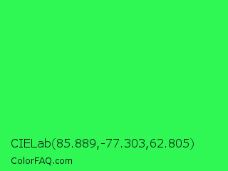 CIELab 85.889,-77.303,62.805 Color is a normal green color and the nearest color is Malachite #0bda51. Hex code #2ff754 and RGB value is rgb(47,247,84). In RGB color space, this color is composed of 18% red, 97% green, 33% blue, In CMYK color space, this color is composed of 81% cyan, 0% magenta, 66% yellow , 3% black , In HSL color space, this color has a hue angle of 131° , 93% saturation and 58% lightness.