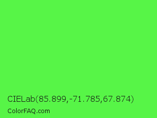 CIELab 85.899,-71.785,67.874 Color is a light green color and the nearest color is Screamin Green #66ff66. Hex code #57f547 and RGB value is rgb(87,245,71). In RGB color space, this color is composed of 34% red, 96% green, 28% blue, In CMYK color space, this color is composed of 64% cyan, 0% magenta, 71% yellow , 4% black , In HSL color space, this color has a hue angle of 114° , 90% saturation and 62% lightness.