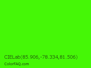 CIELab 85.906,-78.334,81.506 Color is a normal green color and the nearest color is Chlorophyll Green #4aff00. Hex code #45f706 and RGB value is rgb(69,247,6). In RGB color space, this color is composed of 27% red, 97% green, 2% blue, In CMYK color space, this color is composed of 72% cyan, 0% magenta, 98% yellow , 3% black , In HSL color space, this color has a hue angle of 104° , 95% saturation and 50% lightness.
