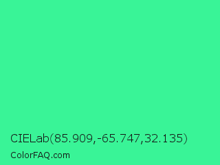 CIELab 85.909,-65.747,32.135 Color is a normal green color and the nearest color is Eucalyptus #44d7a8. Hex code #39f497 and RGB value is rgb(57,244,151). In RGB color space, this color is composed of 22% red, 96% green, 59% blue, In CMYK color space, this color is composed of 77% cyan, 0% magenta, 38% yellow , 4% black , In HSL color space, this color has a hue angle of 150° , 89% saturation and 59% lightness.