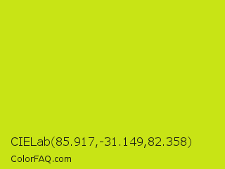 CIELab 85.917,-31.149,82.358 Color is a normal yellow color and the nearest color is Las Palmas #c6e610. Hex code #c8e415 and RGB value is rgb(200,228,21). In RGB color space, this color is composed of 78% red, 89% green, 8% blue, In CMYK color space, this color is composed of 12% cyan, 0% magenta, 91% yellow , 11% black , In HSL color space, this color has a hue angle of 68° , 83% saturation and 49% lightness.