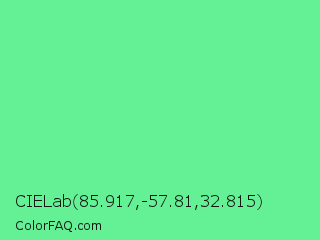 CIELab 85.917,-57.81,32.815 Color is a light green color and the nearest color is Very Light Malachite Green #64e986. Hex code #64f196 and RGB value is rgb(100,241,150). In RGB color space, this color is composed of 39% red, 95% green, 59% blue, In CMYK color space, this color is composed of 59% cyan, 0% magenta, 38% yellow , 5% black , In HSL color space, this color has a hue angle of 141° , 83% saturation and 67% lightness.