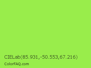 CIELab 85.931,-50.553,67.216 Color is a light green color and the nearest color is Kiwi #8ee53f. Hex code #99ed4b and RGB value is rgb(153,237,75). In RGB color space, this color is composed of 60% red, 93% green, 29% blue, In CMYK color space, this color is composed of 35% cyan, 0% magenta, 68% yellow , 7% black , In HSL color space, this color has a hue angle of 91° , 82% saturation and 61% lightness.
