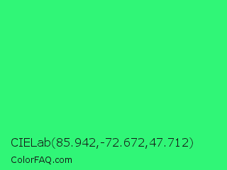 CIELab 85.942,-72.672,47.712 Color is a normal green color and the nearest color is UFO Green #3cd070. Hex code #30f677 and RGB value is rgb(48,246,119). In RGB color space, this color is composed of 19% red, 96% green, 47% blue, In CMYK color space, this color is composed of 80% cyan, 0% magenta, 52% yellow , 4% black , In HSL color space, this color has a hue angle of 142° , 92% saturation and 58% lightness.