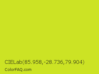 CIELab 85.958,-28.736,79.904 Color is a normal yellow color and the nearest color is Pear #d1e231. Hex code #cce324 and RGB value is rgb(204,227,36). In RGB color space, this color is composed of 80% red, 89% green, 14% blue, In CMYK color space, this color is composed of 10% cyan, 0% magenta, 84% yellow , 11% black , In HSL color space, this color has a hue angle of 67° , 77% saturation and 52% lightness.