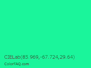 CIELab 85.969,-67.724,29.64 Color is a normal green color and the nearest color is Medium Spring Green #00fa9a. Hex code #1af59c and RGB value is rgb(26,245,156). In RGB color space, this color is composed of 10% red, 96% green, 61% blue, In CMYK color space, this color is composed of 89% cyan, 0% magenta, 36% yellow , 4% black , In HSL color space, this color has a hue angle of 156° , 92% saturation and 53% lightness.
