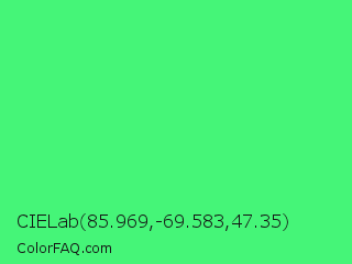 CIELab 85.969,-69.583,47.35 Color is a light green color and the nearest color is Very Light Malachite Green #64e986. Hex code #45f578 and RGB value is rgb(69,245,120). In RGB color space, this color is composed of 27% red, 96% green, 47% blue, In CMYK color space, this color is composed of 72% cyan, 0% magenta, 51% yellow , 4% black , In HSL color space, this color has a hue angle of 137° , 90% saturation and 62% lightness.