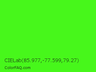 CIELab 85.977,-77.599,79.27 Color is a normal green color and the nearest color is Neon Green #39ff14. Hex code #47f71b and RGB value is rgb(71,247,27). In RGB color space, this color is composed of 28% red, 97% green, 11% blue, In CMYK color space, this color is composed of 71% cyan, 0% magenta, 89% yellow , 3% black , In HSL color space, this color has a hue angle of 108° , 93% saturation and 54% lightness.